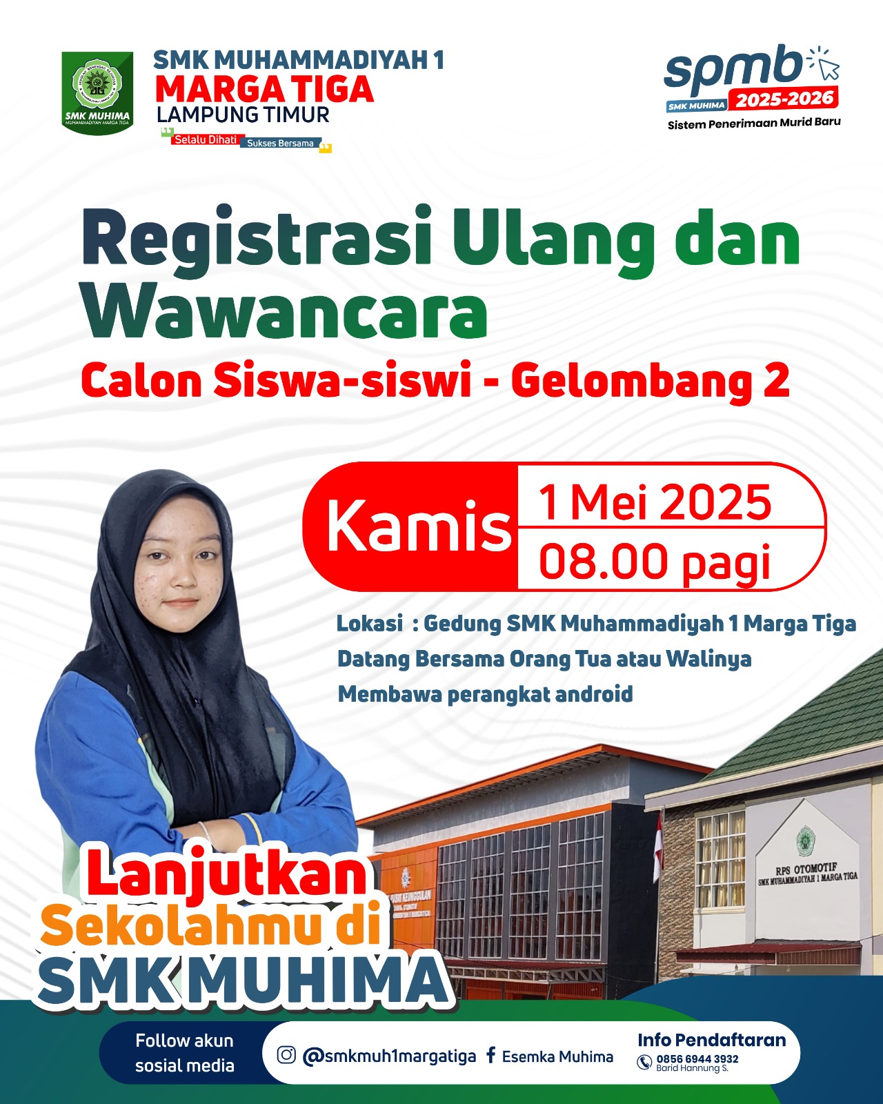 Pemberitahuan Kepada seluruh Calon Siswa/i Baru SMK Muhammadiyah 1 Marga Tiga gelombang 1 yang belum melakukan registrasi daftar ulang langsung ke SMK Muhamamdiyah 1 Marga Tiga, Bagi Pendaftar Gelombang 2 atau yang belum melakukan Tes Pemetaan, diharapkan dapat mengikutinya pada, Kamis 1 Mei 2025 di SMK Muhammadiyah 1 Marga Tiga pukul 08.00 WIB bersama Wali Murid/Orangtua.